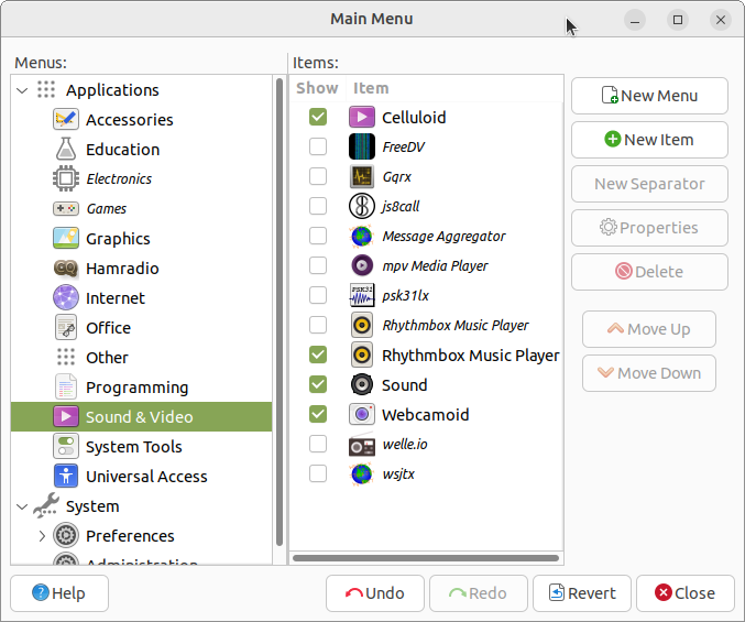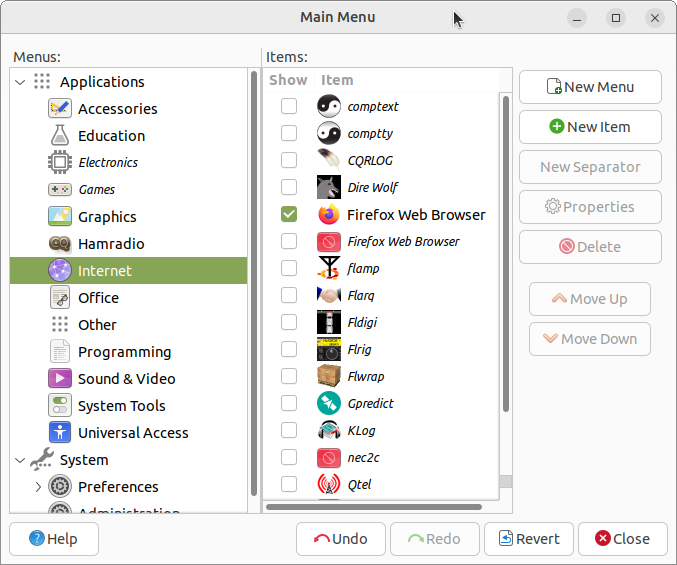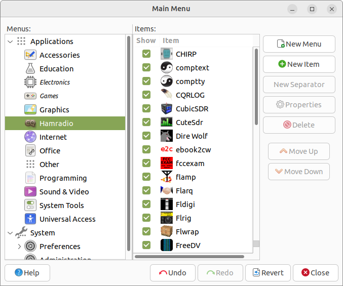 Unfortunately some of the applications in the HamRadio packages are classified under multiple categories. For example Menu => Preferences => Main Menu